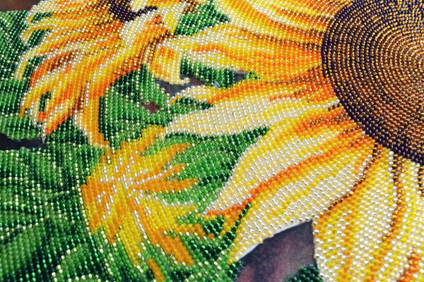 Belangrijk is dat alle pareltjes in dezelfde richting staan. Allemaal naar links wijzend of allemaal naar rechts. U begint best links of rechtsboven en werkt zo rij per rij naar beneden. U hoeft bij het parelborduren niet steeds van garen te wisselen, het zijn nu de parels die voor de kleurnuances zorgen en niet het garen. U begint dus te borduren links met het witte garen en werkt pareltje per pareltje af. U werkt dus niet kleur per kleur of maar rij per rij. Om de pareltjes op de stof te naaien gebruikt u halve kruissteekjes net zoals op foto 2.